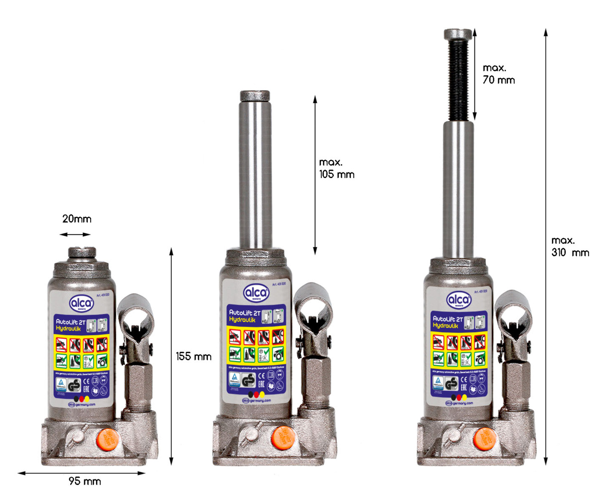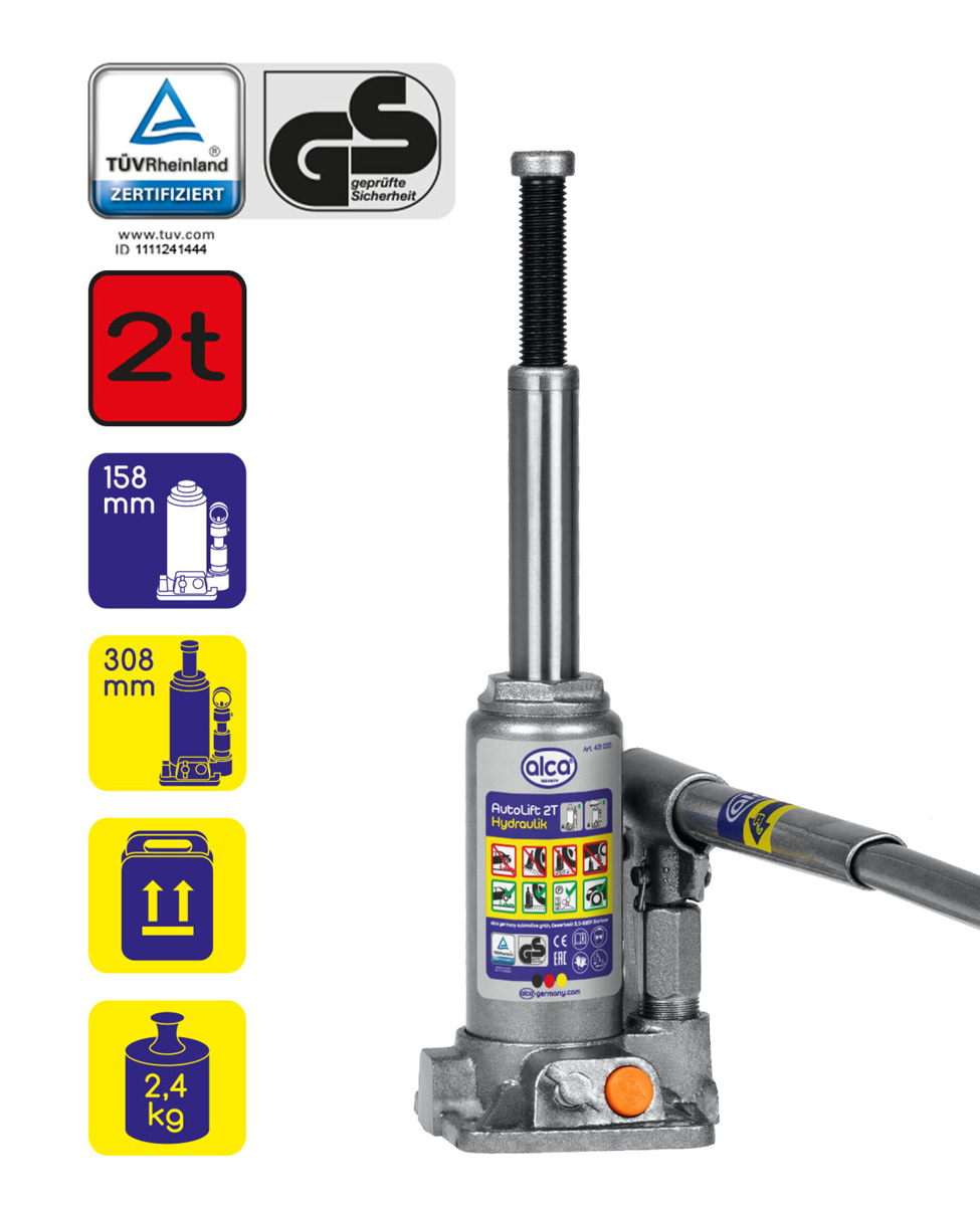 Υδραυλικός γρύλος μπουκάλας της ALCA ιδανικός για την ανύψωση αντικειμένων όπως αυτοκίνητα, με δυνατότητα ανύψωσης έως 31cm και μέγιστό βάρος 2 τόνους.