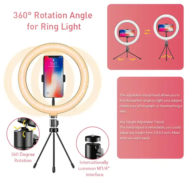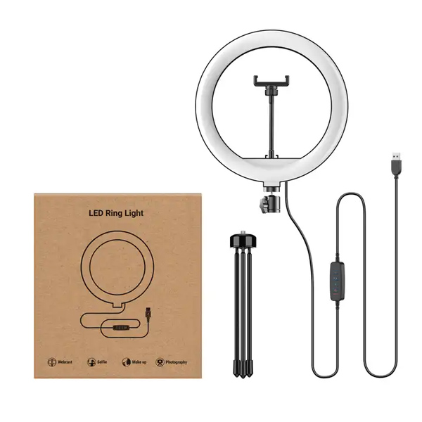Φωτιστικό δαχτυλίδι LED με διάμετρο 26cm, ιδανικό για λήψη φωτογραφιών ή βίντεο, μακιγιάζ και live μεταδόσεις. Διαθέτει λαμπτήρα που προσφέρει τη δυνατότητα αλλαγής θερμοκρασίας χρώματος (φυσικό λευκό, ψυχρό λευκό & θερμό λευκό) αλλά και την μείωση/αύξηση της φωτεινότητας. Συνοδεύεται από μίνι τρίποδα με εύκαμπτη βάση για smartphone.