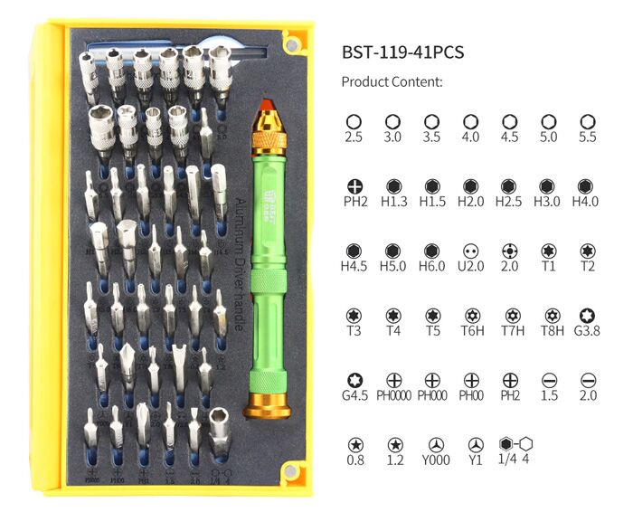 1x screwdriver set (2.5, 3.0, 3.5, 4.0, 4.5, 5.0, 5.5, PH2, H1.3, H1.5, H2.0, H2.5, H3.0, H4.0, H4.5, H5.0, H6.0, U2.0, 2.0, T1, T2, T3, T4, T5, T6H, T7H, T8H, G3.8, G4.5, PH0000, PH000, PH00, PH2, 1.5, 2.0, 0.8, 1.2, Y000, Y1, 1/4 4)