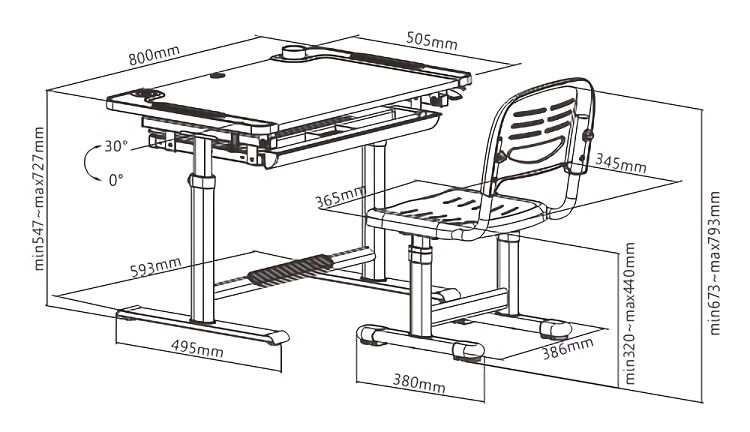 Το σετ παιδικού γραφείου B301, αποτελείται από ένα πλήρως ρυθμιζόμενο, εργονομικό γραφείο και ένα, επίσης ρυθμιζόμενο, κάθισμα, προσφέροντας έναν ιδανικό χώρο εργασίας στο παιδί, καθώς μεγαλώνει. Το γραφείο έχει ρυθμιζόμενο ύψος και γωνία κλίση της επιφάνειας εργασίας, μέσω ενός ειδικού μηχανισμού, ο οποίος είναι εύκολος στην χρήση, ακόμη και από το παιδί. Η ρύθμιση της κλίσης της επιφάνειας είναι πολύ σημαντική, καθώς προσφέρει έναν εργονομικό χώρο εργασίας και αποτρέπει τις αντανακλάσεις, ώστε να μην κουράζονται τα μάτια. Το γραφείο διαθέτει ένα μεγάλο και πολύ πρακτικό συρτάρι με θήκες, υποπόδιο και κρεμάστρα σακιδίου. Το κάθισμα ρυθμίζεται καθ’ ύψος και είναι σταθερό, άνετο, ελαφρύ και ανθεκτικό.