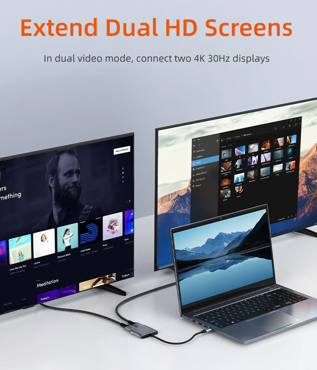 Υποστηρίζει MST λειτουργία χάρη στην οποία, καθιστά δυνατή, την ταυτόχρονη σύνδεση οθονών από τις θύρες HDMI (υποστηρίζεται επέκταση οθόνης). Επιπλέον, μέσω της θύρας USB-C PD μπορείτε να φορτίσετε το laptop σας με απόδοση έως 100W.