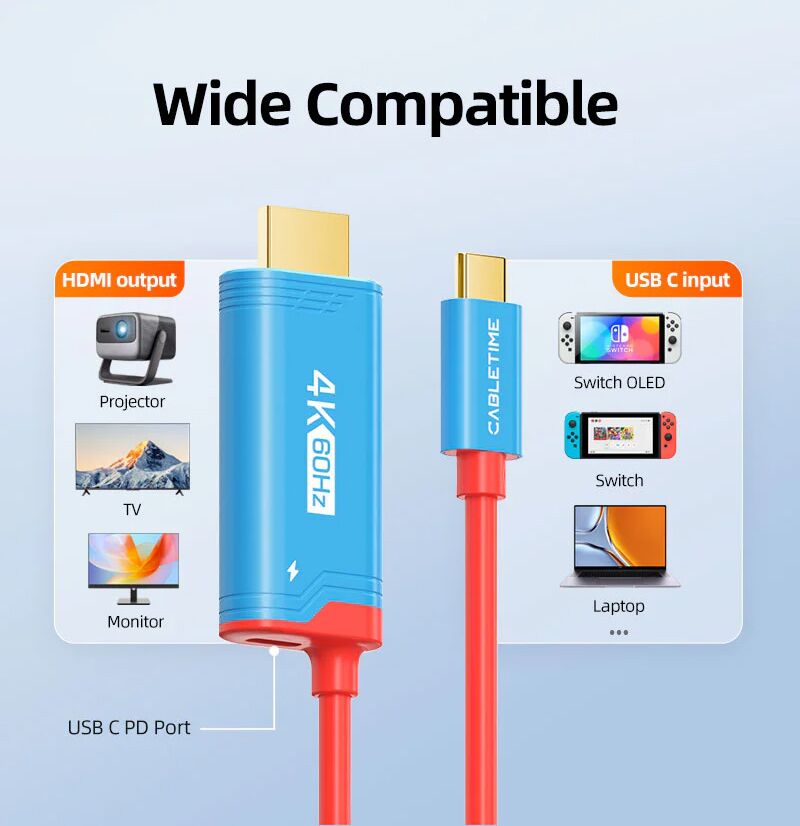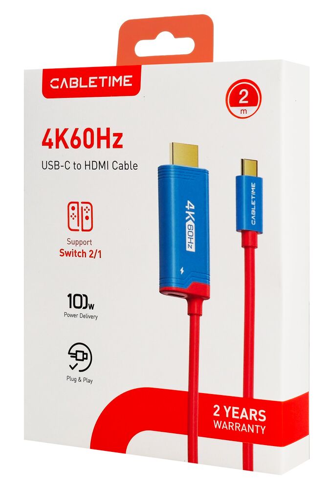 Καλώδιο της Cabletime για τη σύνδεση μιας οθόνης HDMI με μια συσκευή μέσω θύρας USB-C. Διαθέτει θύρα τροφοδοσίας USB-C που υποστηρίζει φόρτιση με απόδοση έως 100W. Είναι ιδανικό για gaming κονσόλες όπως το Nintendo Switch 1/2.