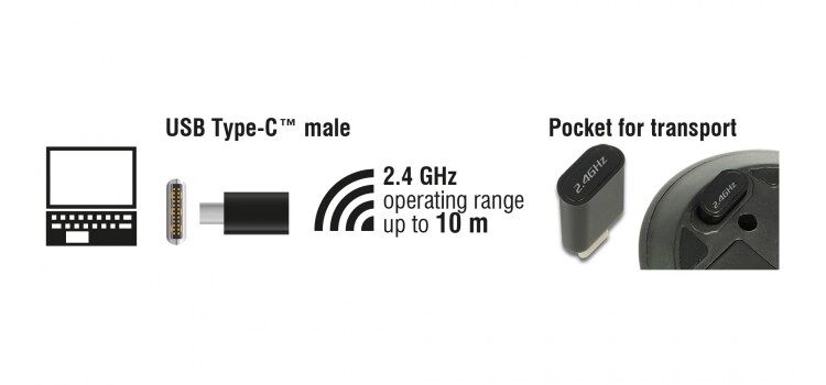 DELOCK ασύρματο ποντίκι 12526, Οπτικό, USB-C receiver, 3-button, μαύρο