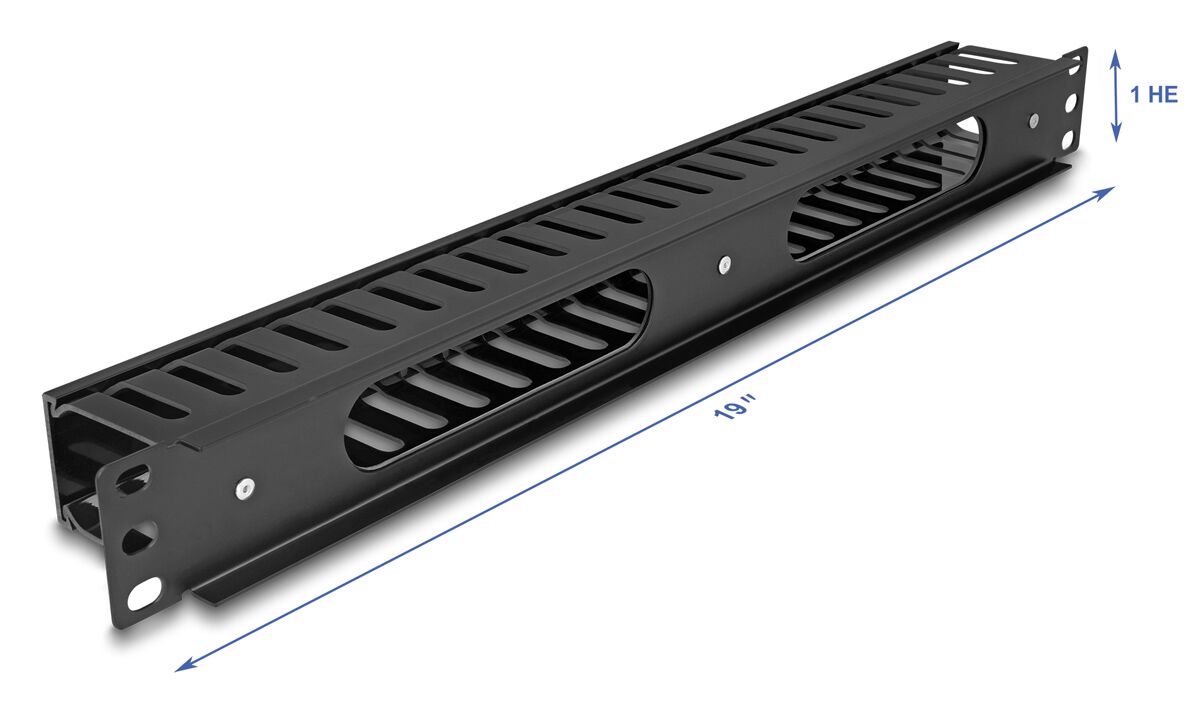 Cable management της Delock κατάλληλο για τοποθέτηση σε 19″ καμπίνες rack. Διαθέτει ανοίγματα στο πάνω και κάτω μέρος αλλά και 2 μεγάλα ανοίγματα στο πίσω μέρος για να περνούν τα καλώδια.