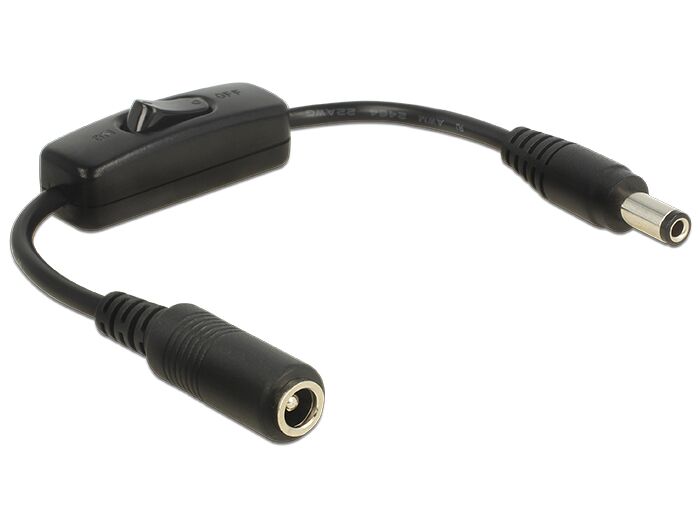 This cable by Delock can be connected to a DC power port. By using the on / off switch the power supply for the connected device can be switched on or off. Therefor it is not needed to remove the cable from the female port to switch off the power supply.