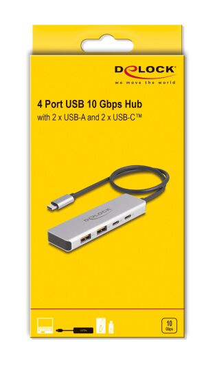 Αυτό το hub της Delock μπορεί να συνδεθεί με το laptop ή το desktop σας μέσω θύρας USB-C και να επεκτείνει τις θύρες του με 2x USB και 2x USB-C θύρες. Διαφορετικές συσκευές USB, όπως docking stations, card readers, εξωτερικοί HDD/SSD κλπ. μπορούν να συνδεθούν μέσω του hub.
