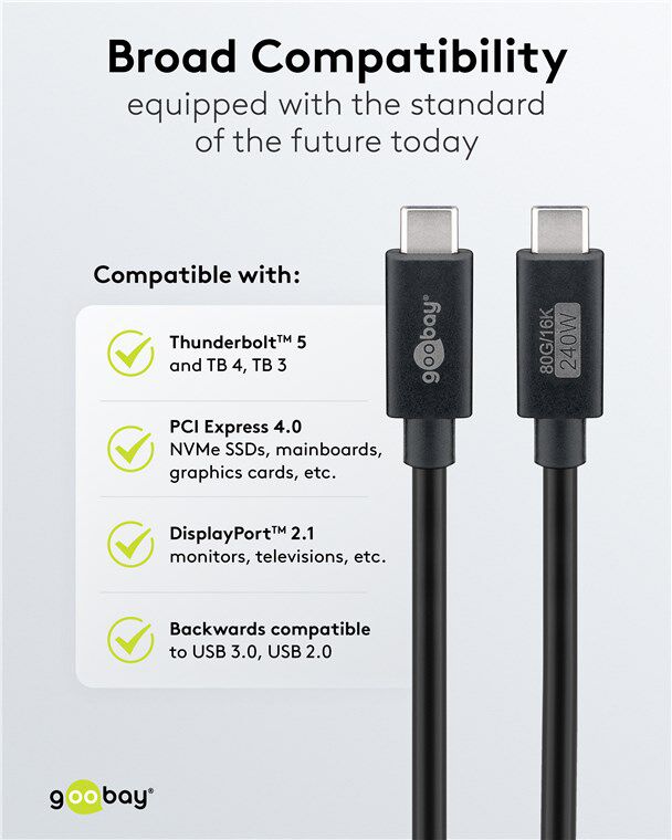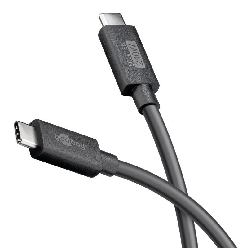 Καλώδιο USB-C της Goobay με εξαιρετικά γρήγορους ρυθμούς μεταφοράς δεδομένων έως 80Gbps και υψηλή απόδοση φόρτισης έως 240W.