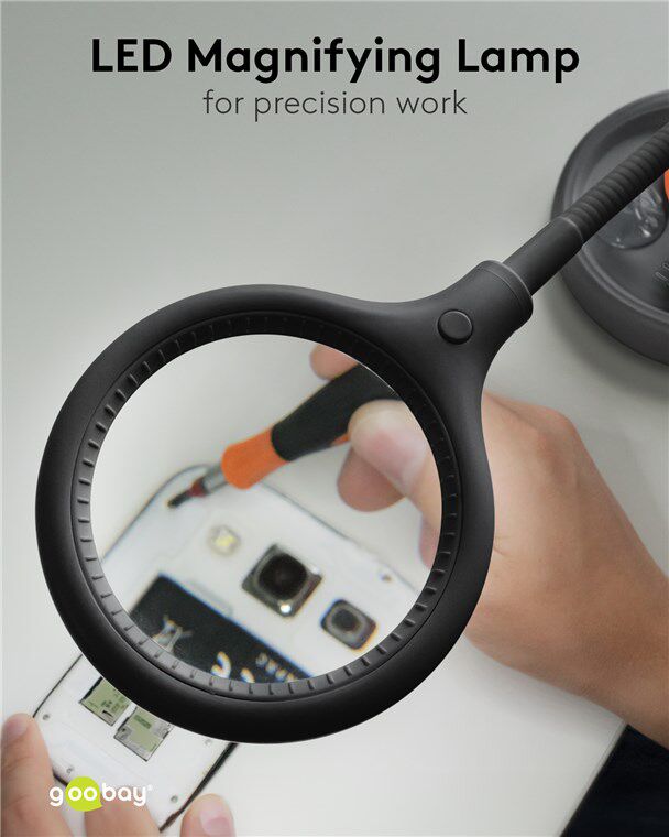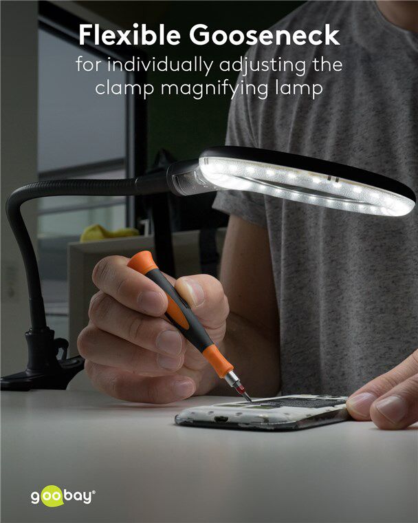 Μεγεθυντικός φακός της Goobay διαμέτρου 100mm, με 3 διόπτρες και μεγέθυνση 1.75x. Διαθέτει φωτιστικό δακτύλιο με 30 SMD LED υψηλής απόδοσης για άνετη εργασία ακόμη και σε σκοτεινά μέρη. Ο βραχίωνας του είναι εύκαμπτος γεγονός που προσφέρει μεγαλύτερη ευελιξία κατά την διάρκεια των εργασιών σας.