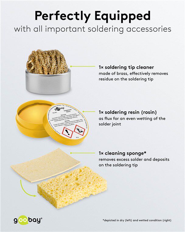 Επιπλέον, διαθέτει θέση για κολλητήρι ενώ στη συσκευασία συμπεριλαμβάνονται σφουγγάρι, συρμάτινο σφουγγάρι και πάστα συγκόλλησης.