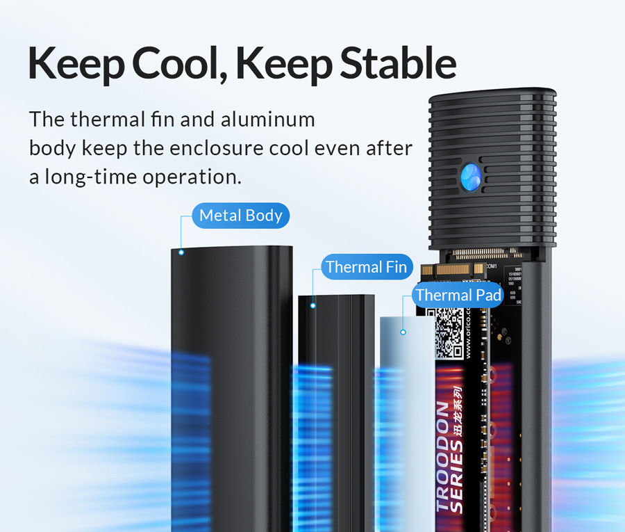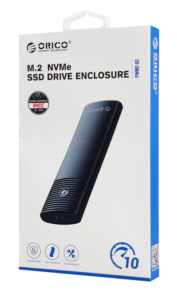 Εξωτερικό περίβλημα της Orico που επιτρέπει την εγκατάσταση ενός δίσκου M.2 NVMe SSD σε μορφή 2280, 2260, 2242 και 2230 και μπορεί να συνδεθεί μέσω θύρας USB-C USB 3.2 Gen2 σε dekstop ή laptop. Είναι ultra compact, κατασκευασμένη από αλουμίνιο, παρέχει άριστη προστασία από θερμότητα και υποστηρίζει ταχύτητες μετάδοσης έως 10Gbps.