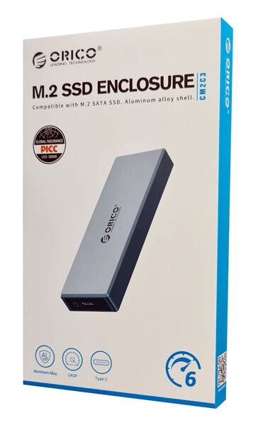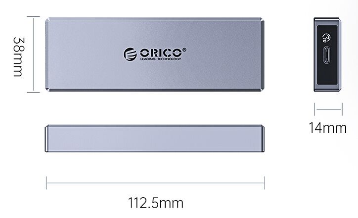 Εξωτερικό περίβλημα της Orico που επιτρέπει την εγκατάσταση ενός δίσκου M.2 SSD σε μορφή 2280, 2260, 2242 και 2230 και μπορεί να συνδεθεί μέσω θύρας USB-C USB 3.2 Gen2 σε dekstop ή laptop. Είναι ultra compact, κατασκευασμένη από αλουμίνιο, παρέχει άριστη προστασία από θερμότητα και υποστηρίζει ταχύτητες μετάδοσης έως 6Gbps.