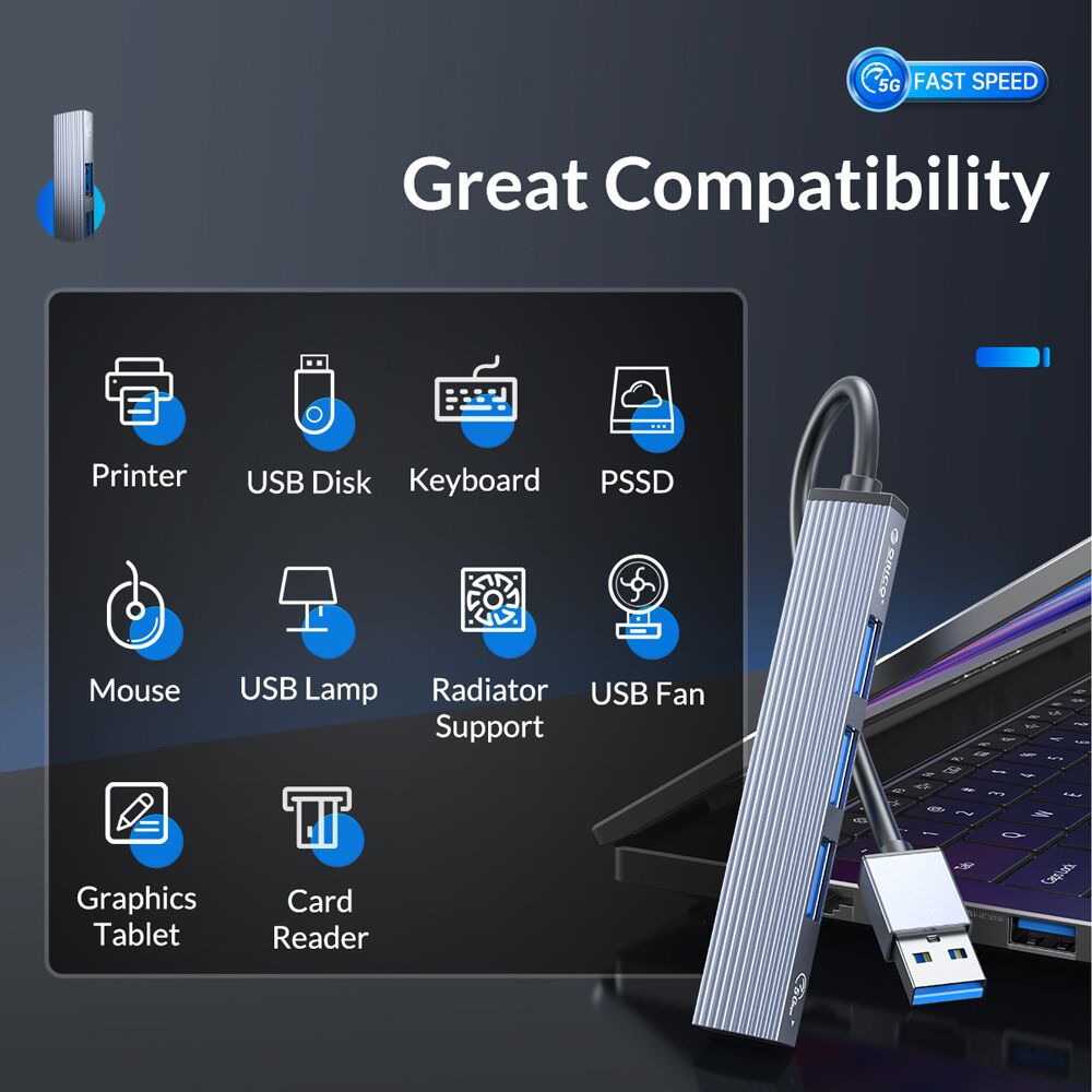 Αυτό το hub της ORICO μπορεί να συνδεθεί με το laptop ή το desktop σας μέσω θύρας USB και να επεκτείνει τις θύρες του με 4x USB θύρες. Διαφορετικές συσκευές USB, όπως εξωτερικοί σκληροί δίσκοι, card readers, ποντίκια κλπ. μπορούν να συνδεθούν μέσω του hub.