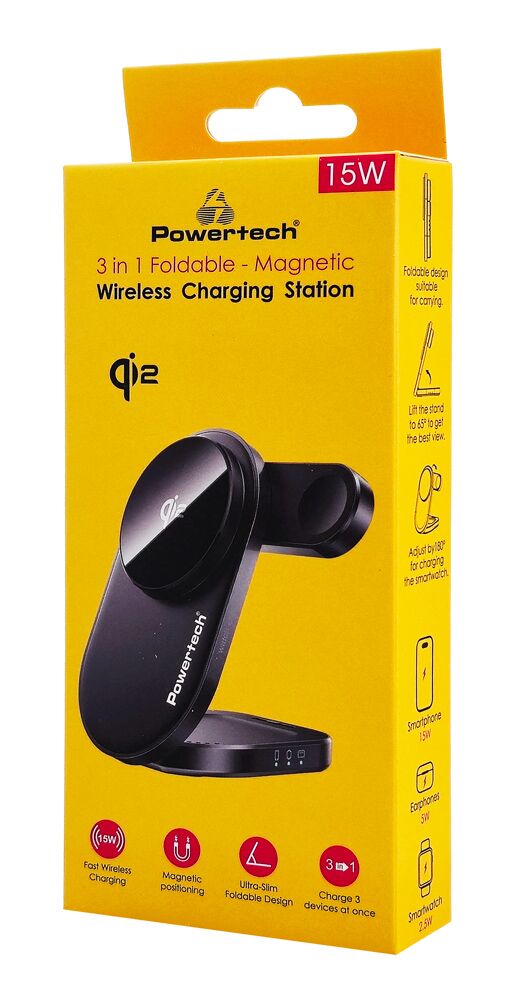 POWERTECH ασύρματος φορτιστής PT-1491, 3 σε 1, Qi2, 15W, μαύρος