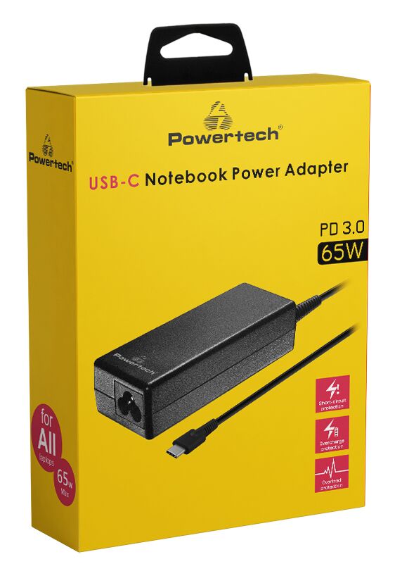 Φορτιστής τοίχου της Powertech για την φόρτιση laptop. Υποστηρίζει πρωτόκολλο γρήγορης φόρτισης PD 3.0 με μέγιστη απόδοση έως 65W.