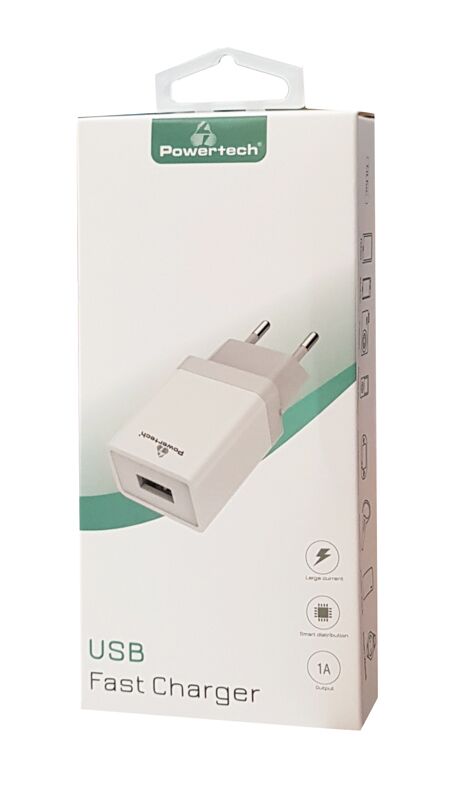 Φορτιστής τοίχου της Powertech, κατασκευασμένος από ανθεκτικό υλικό και συμβατός με συσκευές που φορτίζουν μέσω θύρας USB. Διαθέτει USB θύρα εξόδου που υποστηρίζει φόρτιση με μέγιστη απόδοση 1A.