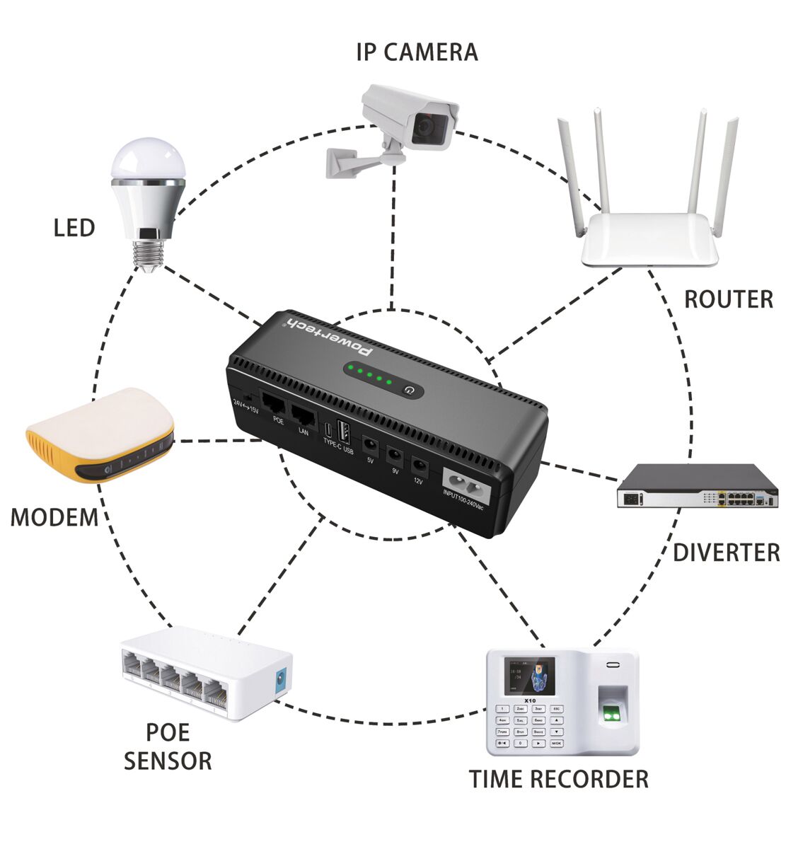 -θύρες εξόδου: 1x DC 5V, 1x DC 9V, 1x DC 12V, 1x USB, 1x USB-C, 1x POE, 1x LAN