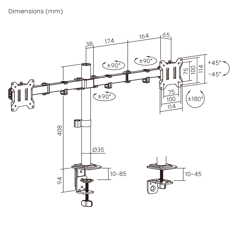 -πάχος επιφάνειας εργασίας: clamp: 10~85mm, grommet: 10~45mm