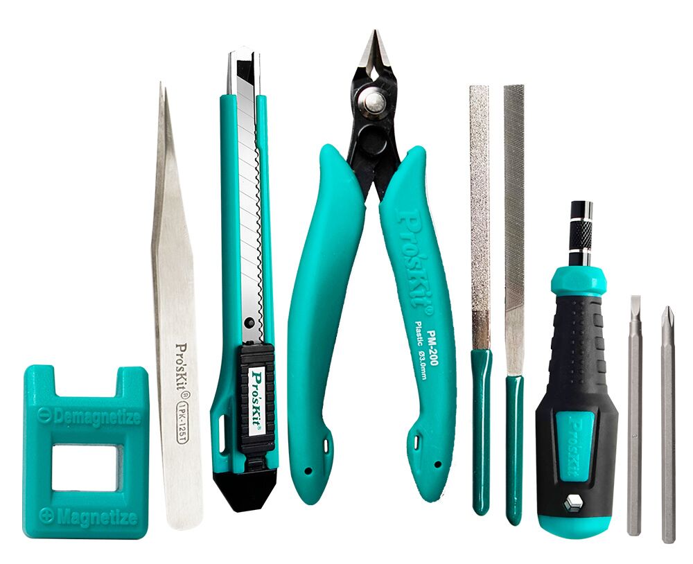 Σετ εργαλείων της PROSKIT το οποίο αποτελείται από πλαγιοκόφτη, κατσαβίδι με 2 μύτες, κοπίδι, ίσια τσιμπίδα, μαγνητιστή/απομαγνητιστή και 2 λίμες.