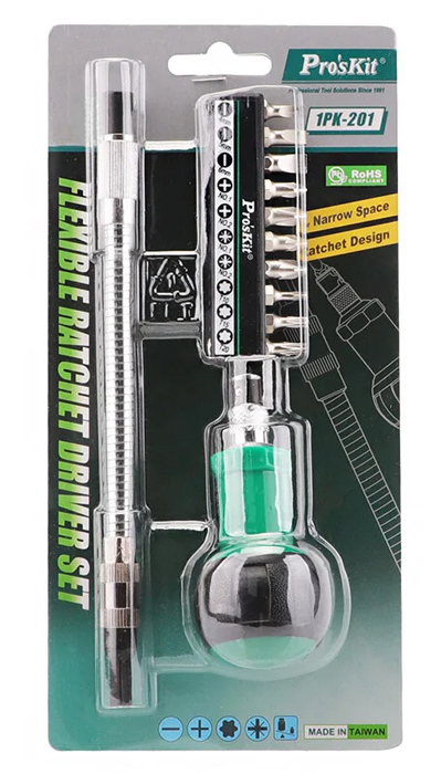 Σετ της PROSKIT το οποίο αποτελείται από 1 κατσαβίδι καστάνιας, 1 εύκαμπτο αντάπτορα επέκτασης και 10 διαφορετικές μύτες κατσαβιδιού.