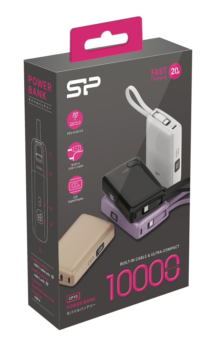 SILICON POWER power bank CP10 με καλώδιο USB-C, 2x θύρες εξόδου, 10000mAh, 20W, μαύρο