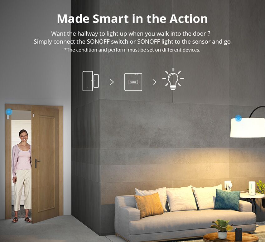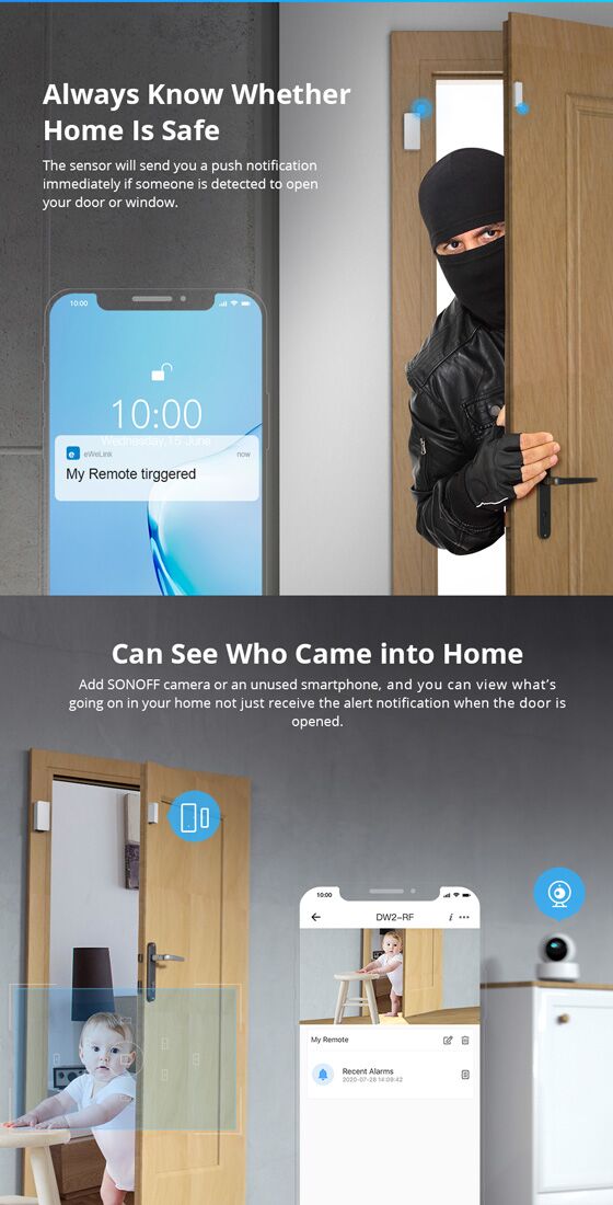 Ο σένσορας DW2-RF της Sonoff τοποθετείται σε πόρτες ή παράθυρα και στέλνει άμεσα ειδοποίηση στο κινητό, σε περίπτωση παραβίασης. Επίσης, προσφέρει την δυνατότητα συνεργασίας με κάμερα ασφαλείας ή ακόμη και ένα παλιό smartphone για την αποστολή εικόνας, ώστε να γνωρίζετε ποιος έχει μπει στον χώρο. Κρατάει ιστορικό 3 μηνών και είναι συμβατός με το app eWeLink. Επίσης μπορεί να συνδεθεί και με τον φωτισμό του χώρου αλλά και με ακόμη περισσότερες συσκευές, εάν συνδυαστεί με IFTTT service.