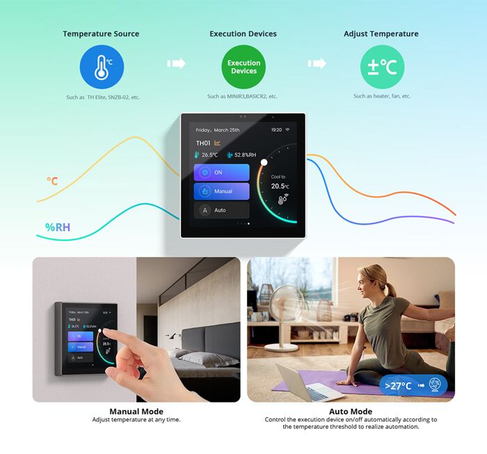 Συνδέεται μέσω Wi-Fi και της εφαρμογής eWeLink με το smartphone σας επιτρέποντας σας να ελέγχετε απομακρυσμένα τις συσκευές σας και υποστηρίζει φωνητικό έλεγχο μέσω Amazon Alexa ή Google Assistant.