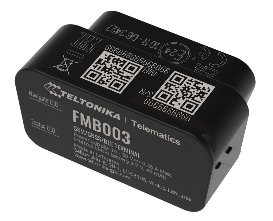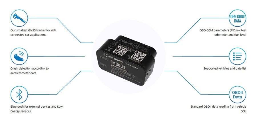 Το FMB003 είναι ένα εξαιρετικά μικρό, plug and play GPS tracker. Το κύριο χαρακτηριστικό του FMB003 είναι η δυνατότητα ανάγνωσης παραμέτρων OEM (PIDs) μέσω θύρας OBD. Με αυτήν τη συσκευή, θα μπορείτε να διαβάζετε δεδομένα οδόμετρου και επιπέδου καυσίμου.