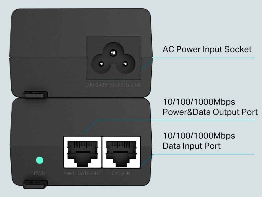 Ports: 1x 10/100/1000Mbps RJ45 data-in port, 1x 10/100/1000Mbps RJ45 power+data-out port, 1x AC socket