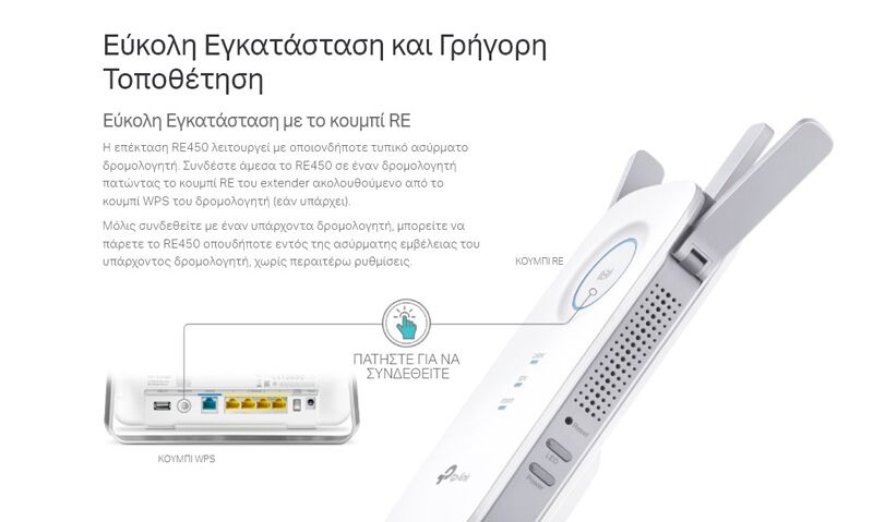 Έχετε κουραστεί από νεκρές ζώνες Wi-Fi στο σπίτι σας; Το RE450 Range Extender συνδέεται ασύρματα με το router Wi-Fi, ενισχύοντας και επεκτείνοντας το σήμα του έως και 1.115 τετραγωνικά μέτρα. Με ταχύτητες έως 450Mbps στα 2,4GHz και 1300Mbps στα 5GHz, αντικαταστήστε τις νεκρές ζώνες με ισχυρό, γρήγορο Wi-Fi σε κάθε δωμάτιο.