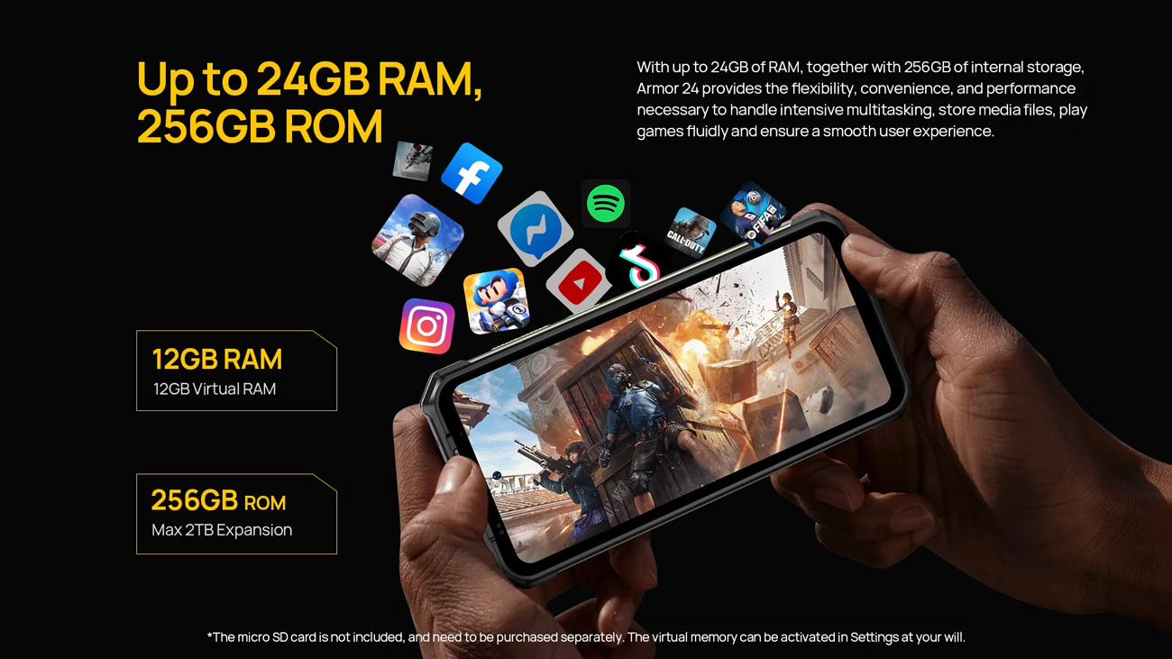 Με 12GB (+12GB virtual) RAM και 256GB ROM για να αποθηκεύετε τα αγαπημένα σας αρχεία, φωτογραφίες και βίντεο. Επιπλέον, προσφέρει την δυνατότητα να επεκτείνετε τον χώρο αποθήκευσης του smartphone με κάρτα micro SD έως 2TB.