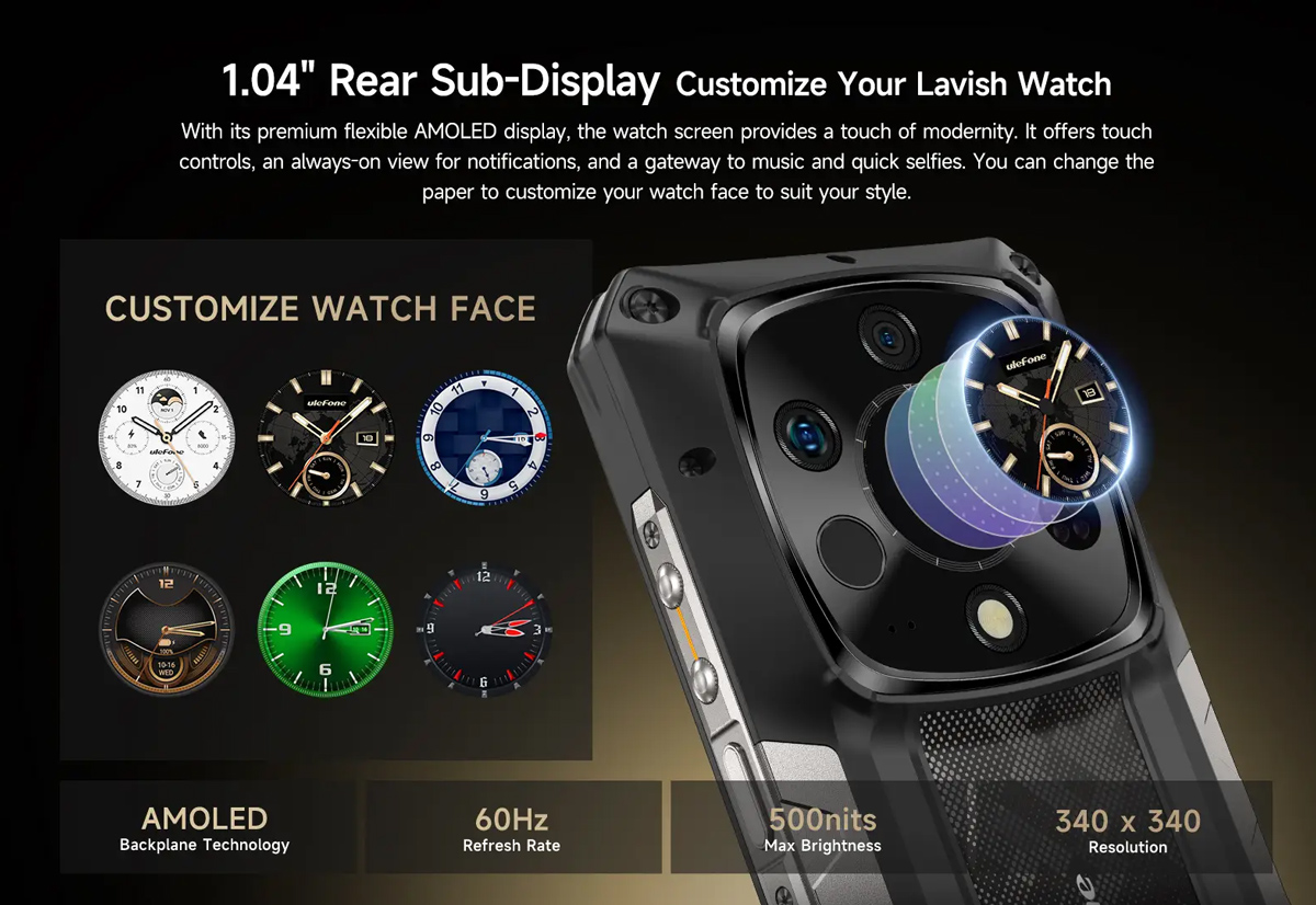 -Πίσω οθόνη: 1.04″ AMOLED, 340×340, 600 nits, 60 Hz, Corning Gorilla Glass Victus