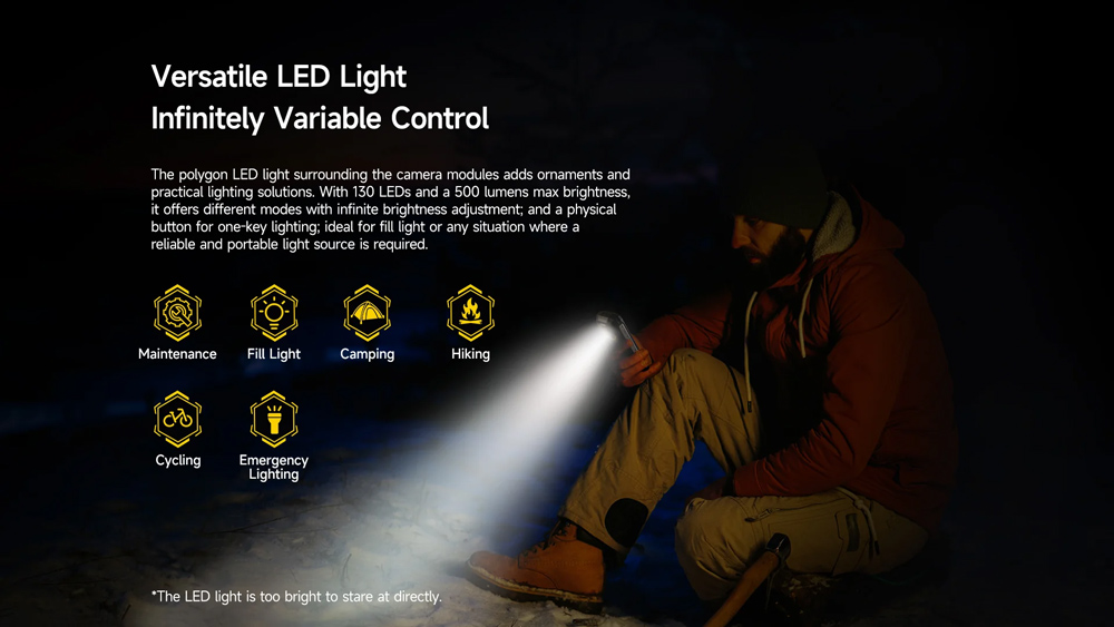Διαθέτει φακό 5W με 500 lumens φωτεινότητα, ικανό να φωτίσει μεγαλύτερες περιοχές γρήγορα με το πάτημα ενός κουμπιού. Επιπλέον, υποστηρίζει λειτουργία φωτός έκτακτης ανάγκης με κόκκινο και μπλε φως.