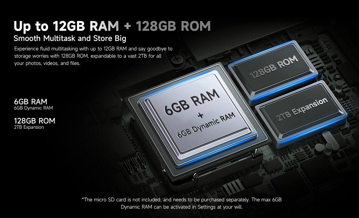 Με 6GB (+6GB virtual) RAM και 128GB ROM για να αποθηκεύετε τα αγαπημένα σας αρχεία, φωτογραφίες και βίντεο. Επιπλέον, προσφέρει την δυνατότητα να επεκτείνετε τον χώρο αποθήκευσης του smartphone με κάρτα micro SD έως 2TB.