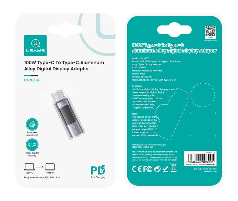 Aντάπτορας USB-C σε USB-C της Usams με οθόνη προβολής της απόδοσης φόρτισης σε πραγματικό χρόνο. Υποστηρίζει φόρτιση με απόδοση έως 100W.
