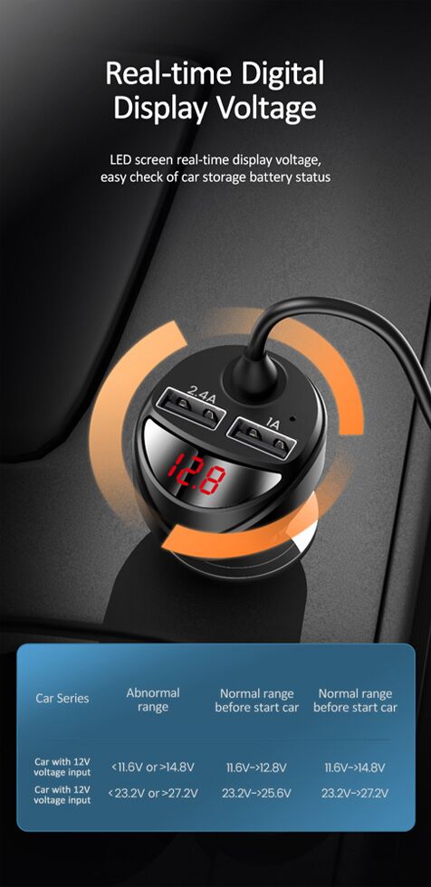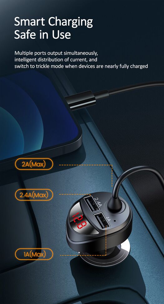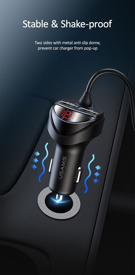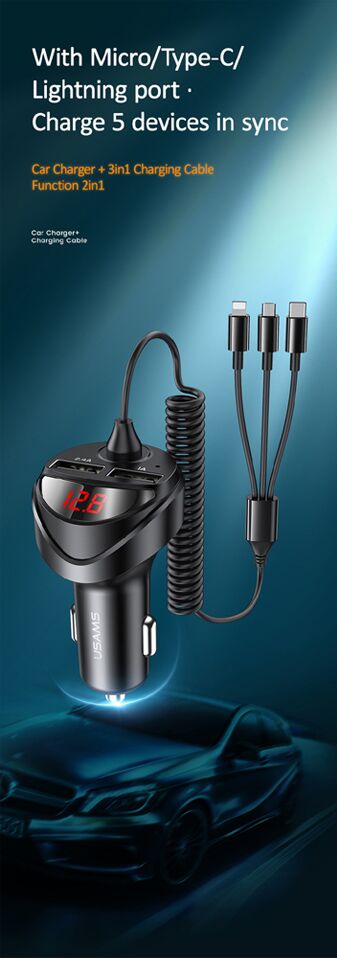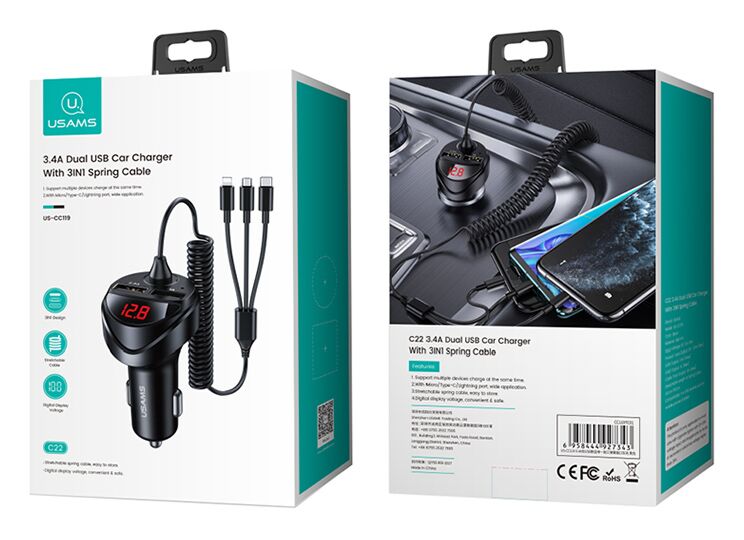 USAMS φορτιστής αυτοκινήτου C22 με καλώδιο 3 σε 1 & οθόνη, 3.4A, μαύρος