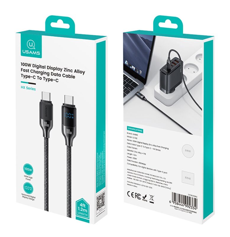 Καλώδιο φόρτισης και μεταφοράς δεδομένων USB-C σε USB-C της Usams. Υποστηρίζει φόρτιση με απόδοση έως 100W και μεταφορά δεδομένων με ταχύτητα έως 480Mbps.
