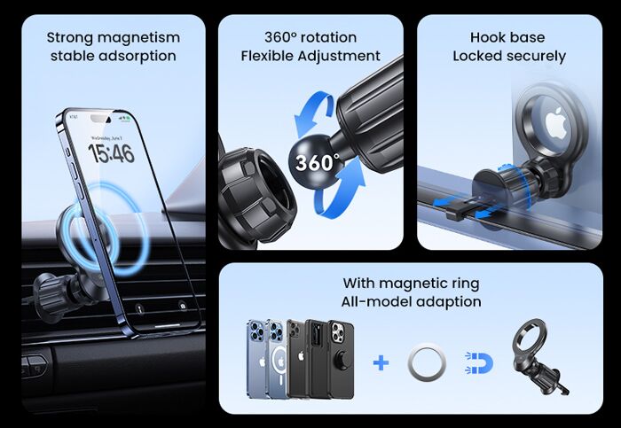 Συγκρατεί το smartphone σταθερό και ασφαλές με ισχυρή μαγνητική δύναμη ενώ η επιφάνεια που μαγνητίζεται το smartphone είναι επενδυμένη από αντιολισθητικό, μαλακό υλικό.