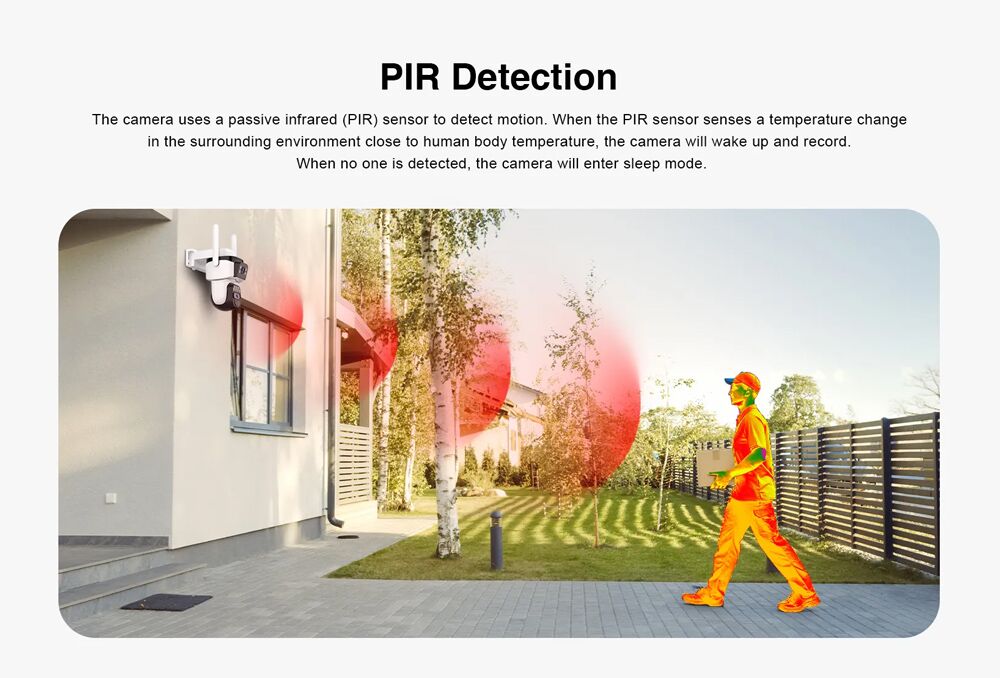 Μπορεί να ανιχνεύσει την ανθρώπινη σιλουέτα και κίνηση, στέλνοντας ειδοποιήσεις στο smartphone σας κάθε φορά που ανιχνεύεται κίνηση αλλά και να ενεργοποιήσει ηχητικό και οπτικό (με φως) συναγερμό.